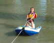 The EZ Ski is an inflatable water ski hybrid using integrated wood ski trainers with bindings,