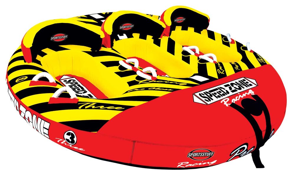 Built for speed and dressed for fun. The Speed Zone Three is designed for three riders, providing a stable ride while easily sliding outside the wake for an exhilarating run! This fast track hot rod features a full nylon cover that is as durable as it is sleek, cockpit seating to keep you in the saddle, high backrests, air cushioned floors for a more comfortable ride, and double webbing foam handles to keep your white knuckles from turning red; Speed Zone Three will keep you in the zone!