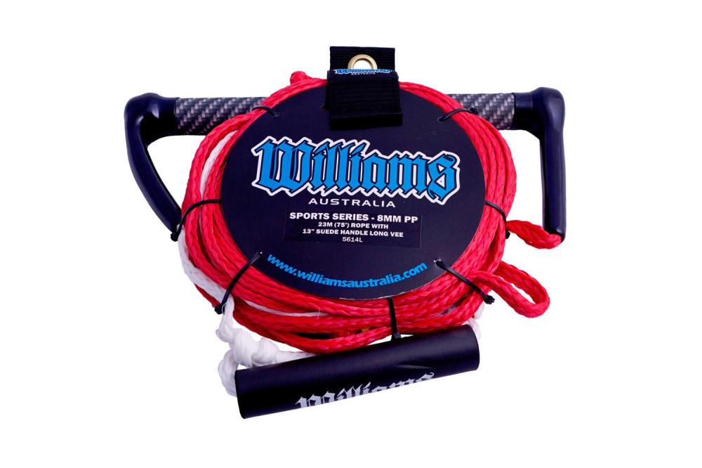23m 80 strand Poly E mainline with Long V 13" Sublimated Suede Handle, including safety cross rope & float. Suitable for skiing and kneeboarding.
